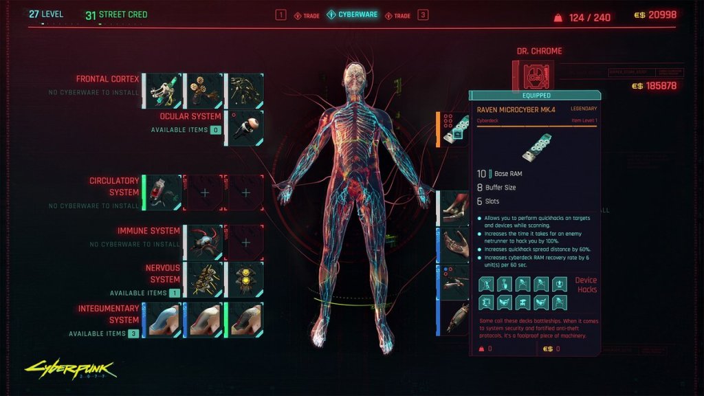 Karakteri ilk yaratmaya başladığımızda çocukluk kahramanımız, hayatımızı şekillendiren kritik olay ve neden Night City’de olduğumuz sorularına cevap vererek backstorymizi belirliyoruz. Hepsinin farklı diyaloglar açacağı da belli. Bunun yanı sıra oyun içinde seçeceğimiz ve gidişatı ve hikayeyi etkileyecek üç tane de life path bulunmakta: Street Child (Sokak Çocuğu), Nomad (Göçebe), Corpo (İş İnsanı). Stat ve skillere gelecek olursak da Body, Intelligence, Reflex, Technical ve Cool statları ve bunlara bağlı birçok skilli yerleştiriyoruz. Peki, gelişim nasıl oluyor? Oyunda ilerledikçe statlarımızın ve skillerimizin gelişeceğini biliyoruz ama bu sadece pasif mi olacak? Evet, ancak aktif skiller için çok daha güzel bir yol var: Siber uzuvlar ve yazılımlar. Oyun boyunca karşılaşacağımız sibertetik uzmanların yardımıyla kolumdan bıçak çıksın, gözümle şöyle bir bakınca her şeyi görüyüm, aldığım hasarı emiyim gibi aktif skillere sahip olup bunları geliştirebileceğiz.