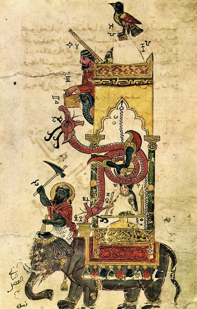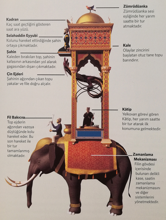 Bundan 9 asır önce El Cezerî, insanlığın çeşitliliğine ve o dönemde İspanya’dan Orta Asya’ya kadar yayılan İslam’ın evrenselliğine duyduğu hayranlığı göstermek için oldukça ayrıntılı olan “Filli Su Saati”ni tasarlamıştı. İslam dünyasının zenginliğini eserine yansıtmak isteyen El Cezeri, Arşimet su prensibine; Hint saati ve Hint fili, Mısır Zümrüdüanka’sı, Arap figürleri, İran halısı ve Çin ejderlerini takviye etmişti.