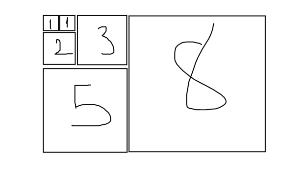 Yukarıda görülen bu parçalara ayrılmış karelerin içinde yazan sayılar bir kenar uzunluğunu gösteriyor. Şimdi burada basit bir alan hesabı yapalım: (1*2)+(1*2)+(3*2)+(5*2)+(8*2)= 8x(8+5). Bu eşitlikten de anlayacağınız üzere Fibonacci sayılarında karelerini alıp topladığımızda ortaya çıkan oran aslında geometriyle de doğrudan alakalı. Bu sayıları birbirine bölersek ortaya çıkan sonuç bize Fibonacci sayı dizisinin gittikçe altın orana yaklaştığını söyleyecektir. Şöyle ki: