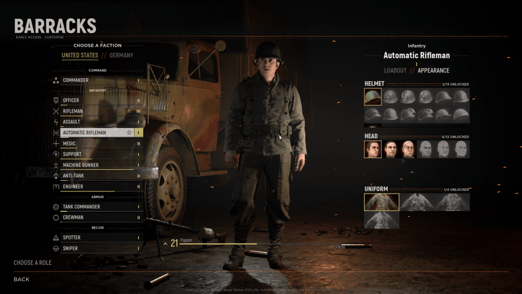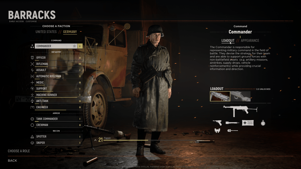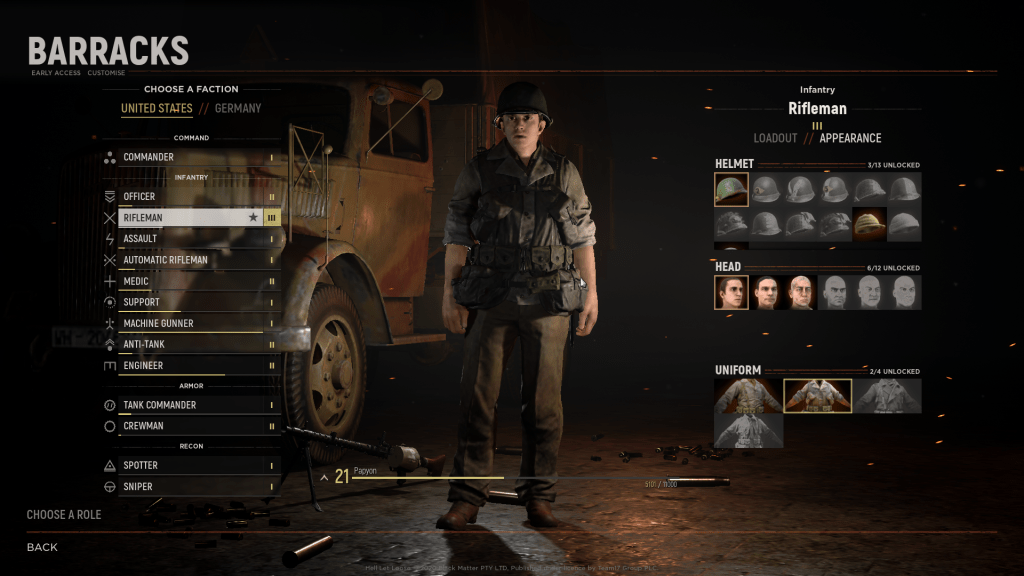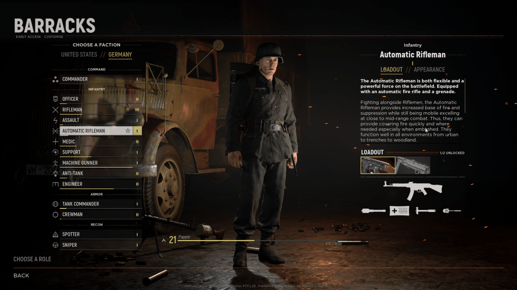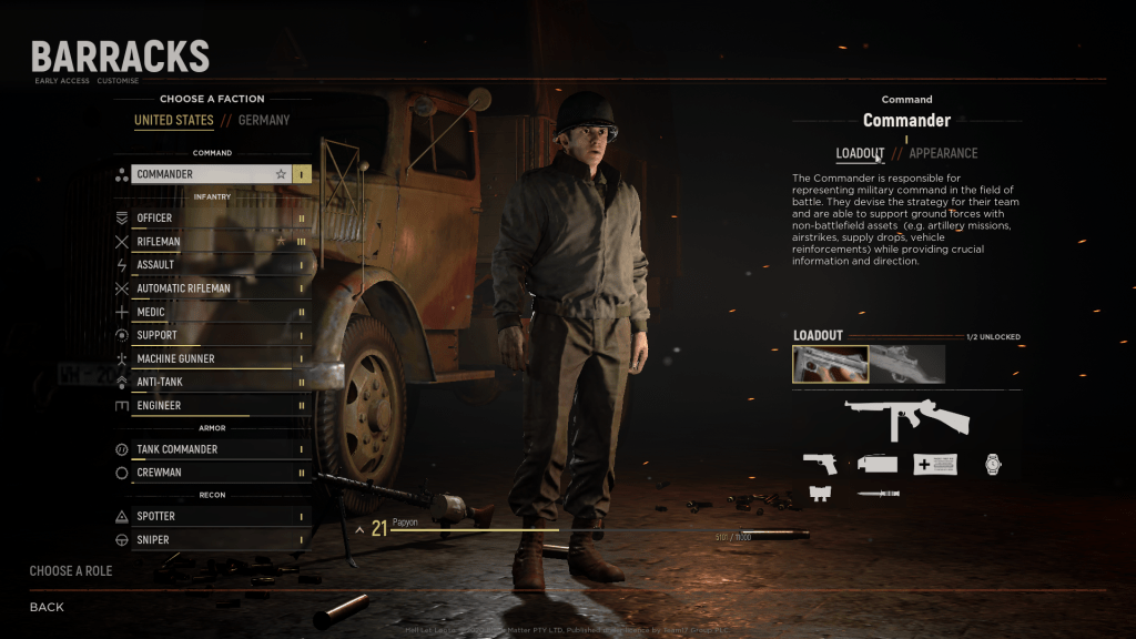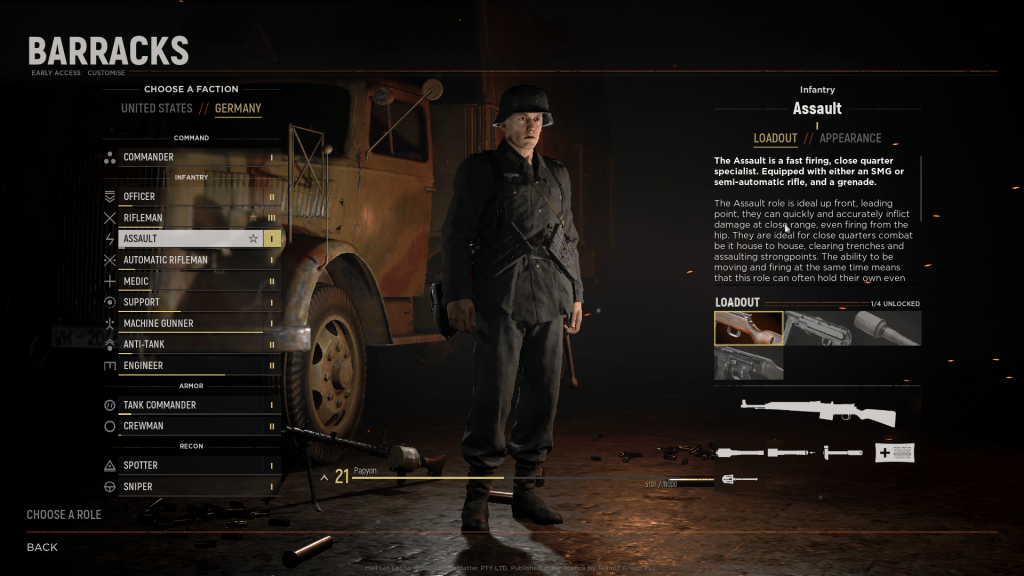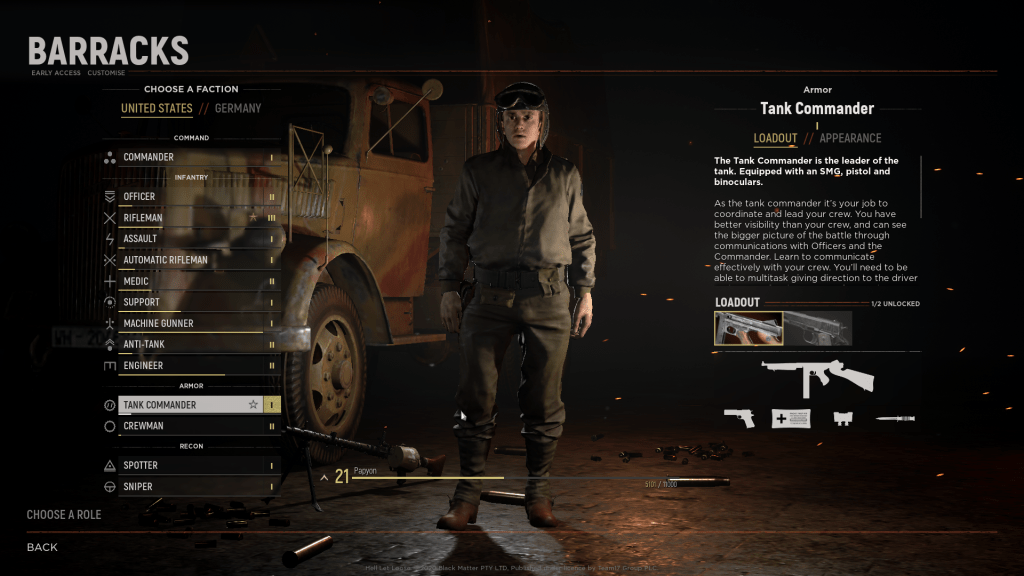 Şuanlık sadece iki ülkemiz var ABD ve Nazi Almanya’sı oyunun konsepti tahmin edebileceğiniz gibi 2.Dünya savaşı ve gerçekten gerçekliği iyi yansıtıyor ve sizi savaş ortamına sokarak o havaya girmenizi sağlıyor. Oyunumuz da sesli sohbet var ve bu sohbet şu şekilde üçe ayrılıyor . Yalnızca takım liderleri ve komutanın konuşabildiği bir kanal takım üyelerinin konuşabildiği bir kanal ve yakınınızda bulunan ülkenizdeki oyuncular ile konuşabildiğiniz bir kanal. Oyunda her ülkenin kendine has silahları ve araçları mevcut.Çeşitli haritalar var lakin bir müddet sonra aynı haritalar ve ülkeler oyuncuyu sıkıyor bunu anlayan yayıncılardan da bir haber geldi oyuna Sovyetler Birliği’ni eklemek için çalışmalar yaptıklarını söylediler benim görüşüm zamanla ülke ve silah sayısının artacağı yönünde dediğim gibi hala betada oyun. Oyunun kötü yanlarına gelecek olursak seviye atlamak ve karakterimizi geliştirmek aşırı zor çünkü bir maç yaklaşık bir saat sürüyor, evet bir saat ve ayrıca maç bitmeden sunucudan ayrılırsanız kazandığınız xp size gelmiyor bu benim için bir eksi çünkü bir saat gibi uzun bir süre benim için çok fazla. Şimdi dilerseniz karakterler ekipmanları ve araçların fotoğraflarına bakalım