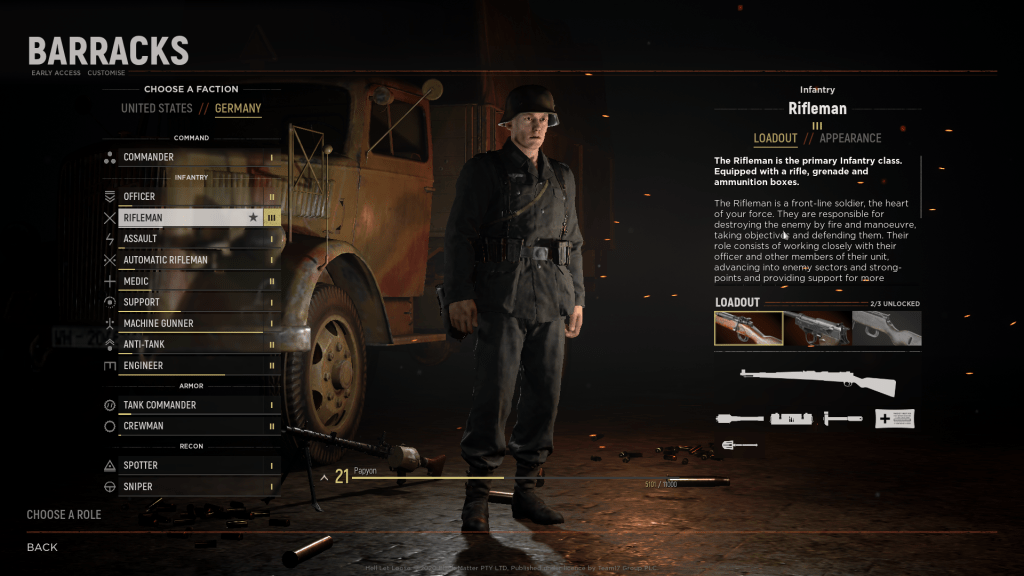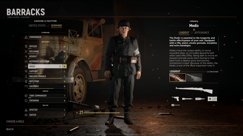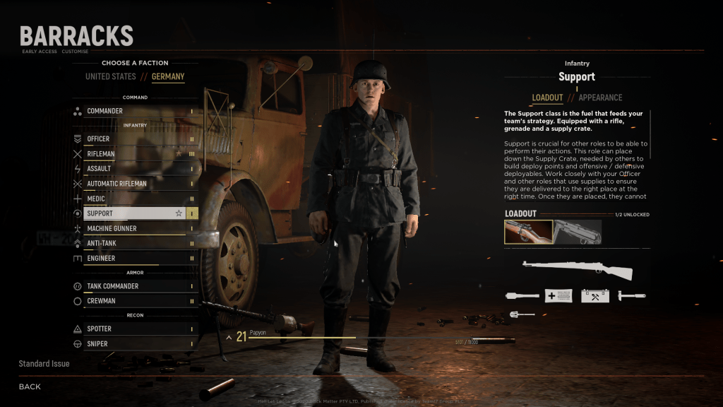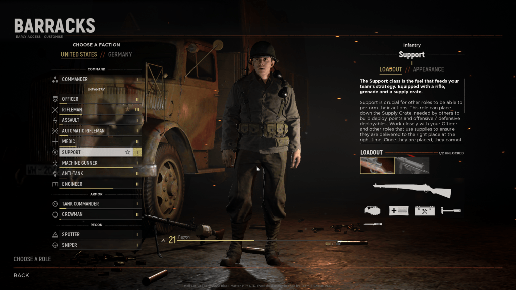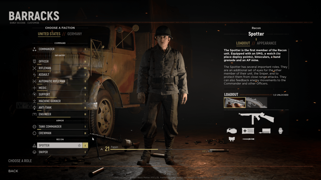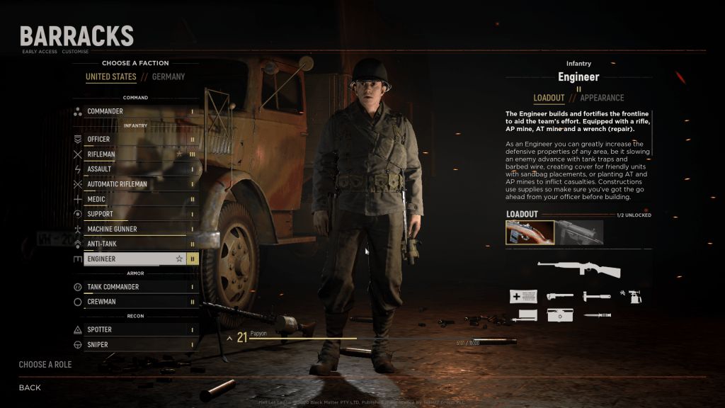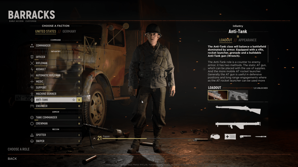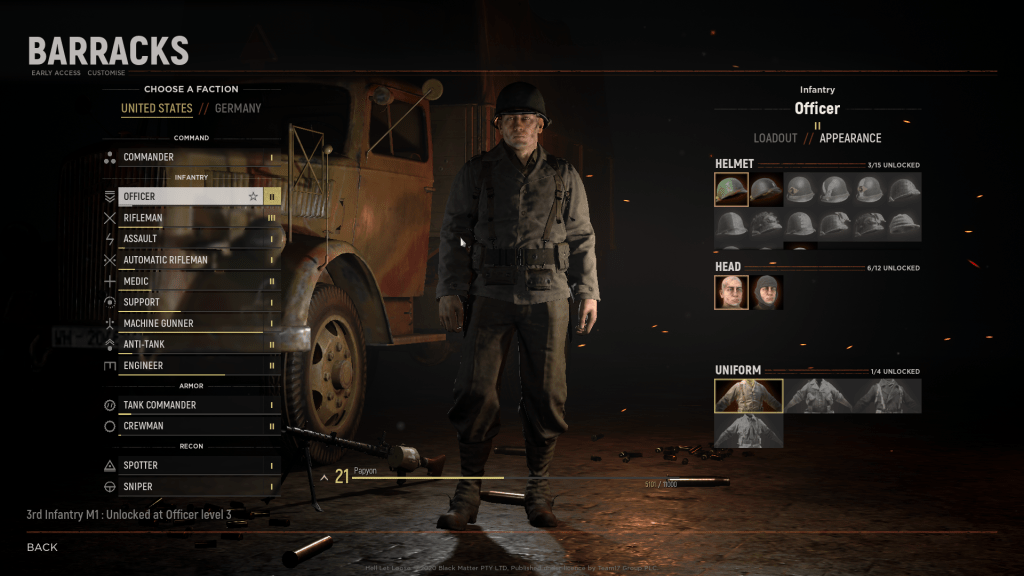 Şuanlık sadece iki ülkemiz var ABD ve Nazi Almanya’sı oyunun konsepti tahmin edebileceğiniz gibi 2.Dünya savaşı ve gerçekten gerçekliği iyi yansıtıyor ve sizi savaş ortamına sokarak o havaya girmenizi sağlıyor. Oyunumuz da sesli sohbet var ve bu sohbet şu şekilde üçe ayrılıyor . Yalnızca takım liderleri ve komutanın konuşabildiği bir kanal takım üyelerinin konuşabildiği bir kanal ve yakınınızda bulunan ülkenizdeki oyuncular ile konuşabildiğiniz bir kanal. Oyunda her ülkenin kendine has silahları ve araçları mevcut.Çeşitli haritalar var lakin bir müddet sonra aynı haritalar ve ülkeler oyuncuyu sıkıyor bunu anlayan yayıncılardan da bir haber geldi oyuna Sovyetler Birliği’ni eklemek için çalışmalar yaptıklarını söylediler benim görüşüm zamanla ülke ve silah sayısının artacağı yönünde dediğim gibi hala betada oyun. Oyunun kötü yanlarına gelecek olursak seviye atlamak ve karakterimizi geliştirmek aşırı zor çünkü bir maç yaklaşık bir saat sürüyor, evet bir saat ve ayrıca maç bitmeden sunucudan ayrılırsanız kazandığınız xp size gelmiyor bu benim için bir eksi çünkü bir saat gibi uzun bir süre benim için çok fazla. Şimdi dilerseniz karakterler ekipmanları ve araçların fotoğraflarına bakalım